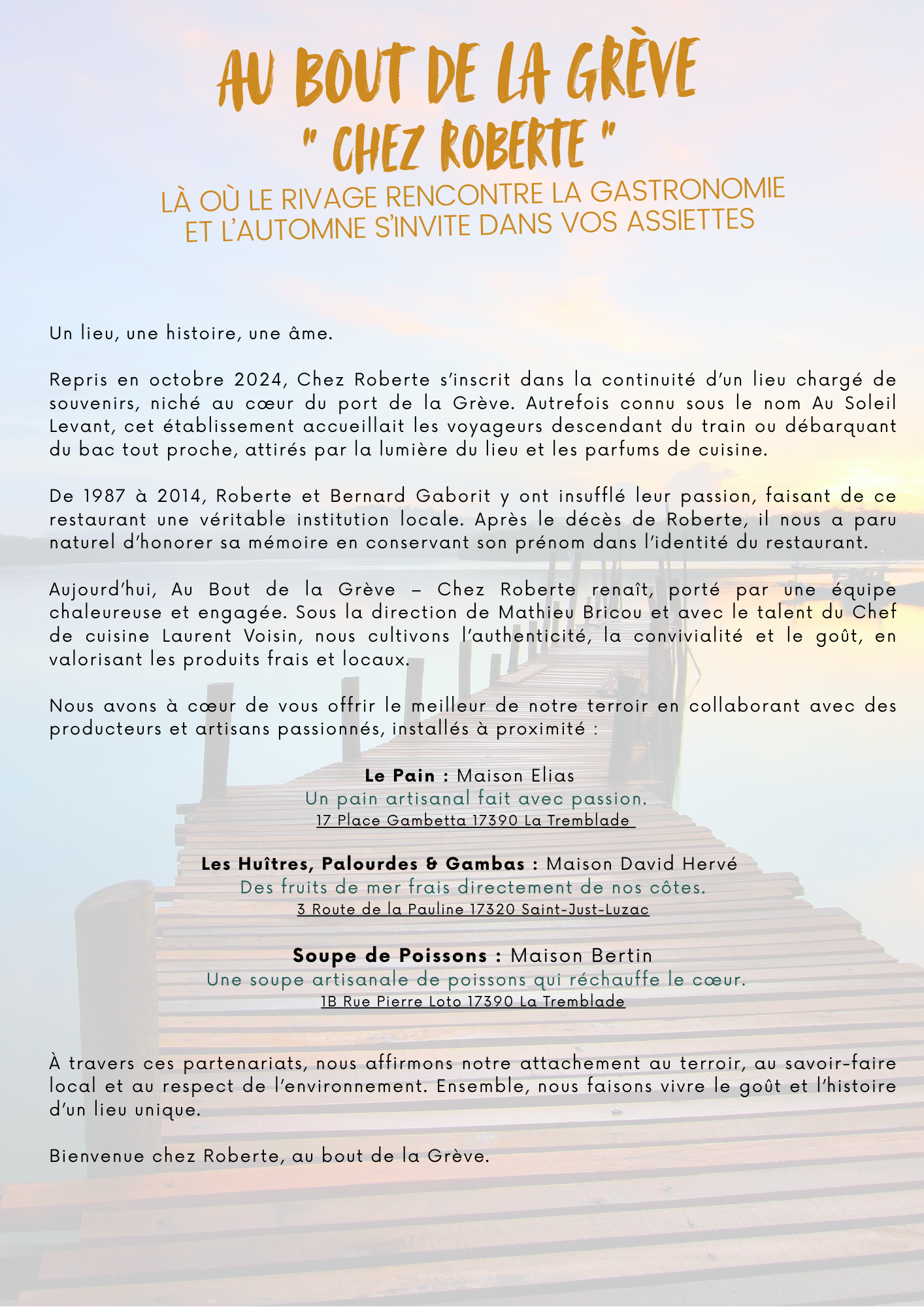Que vous soyez à la recherche d’un déjeuner paisible face à l’horizon ou d’un dîner plus intime, Au Bout de la Grève Chez “Roberte” vous invite à vivre une expérience culinaire unique, dans une ambiance chaleureuse et accueillante. Venez découvrir un lieu où chaque détail est pensé pour votre confort et votre plaisir gastronomique.
